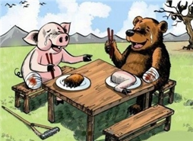 各花入各眼,這幅圖在我們礦山行業(yè)的人看來(lái)寓意更加深刻。這幅圖表面意思,一個(gè)餐桌上坐著一個(gè)豬,和一個(gè)熊在吃飯,熊吃著豬蹄,豬吃著熊掌,兩個(gè)邊吃邊流淚邊笑。無(wú)關(guān)者眼中豬和熊都舍不得吃自己的肉,但又都饞,于是換肉吃,但換來(lái)?yè)Q去,不還相當(dāng)于吃自己的肉嗎?所以圖中他們一邊笑著一邊卻在哭。