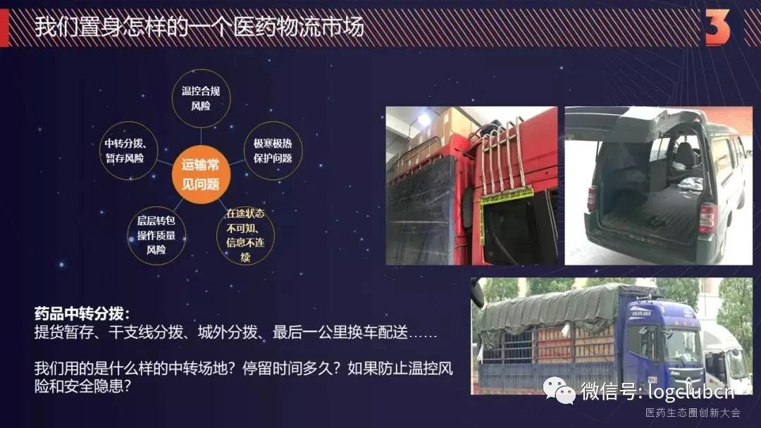 極寒、極熱情況下,夏天最高溫度40度,怎么樣保證藥品的質(zhì)量?在途的狀態(tài),尤其是運輸這一端,在座的藥廠、批發(fā)商不管是自己配送還是委托第三方配送,如何能確保是百分之百的可知、可視嗎?我們在運輸這一塊也有層層轉包。所以說藥品運輸風險是非常值得關注的一個點,這只是我們調(diào)研拍到的一些照片,風險更大的照片我沒有展示出來,因為放照片的目的不是曝光。