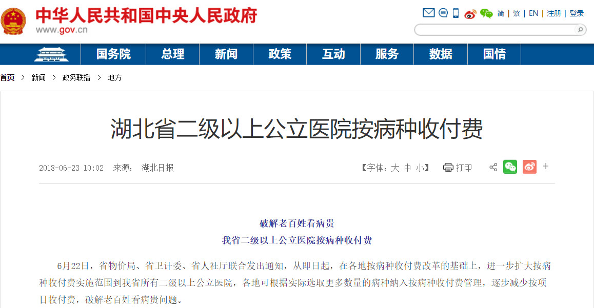 昨日,《湖北日?qǐng)?bào)》刊文:湖北省按病種收付費(fèi)實(shí)施范圍,將從17家重點(diǎn)醫(yī)院,擴(kuò)展到全省所有二級(jí)以上公立醫(yī)院。