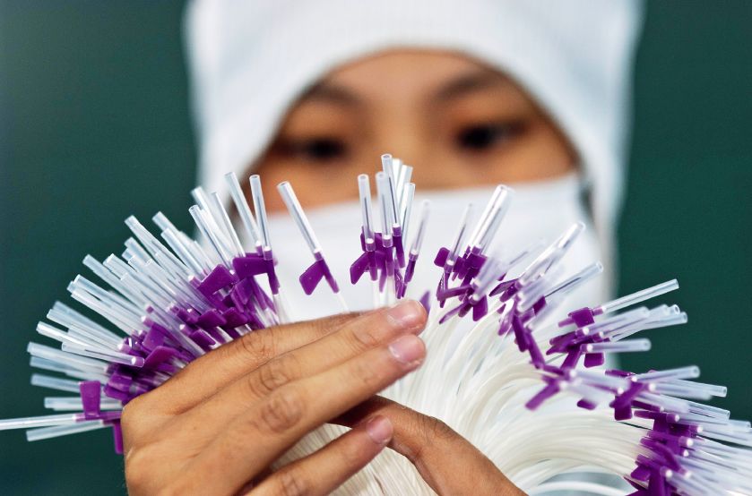 (資料圖片)生產(chǎn)線上的輸液針。圖/新華