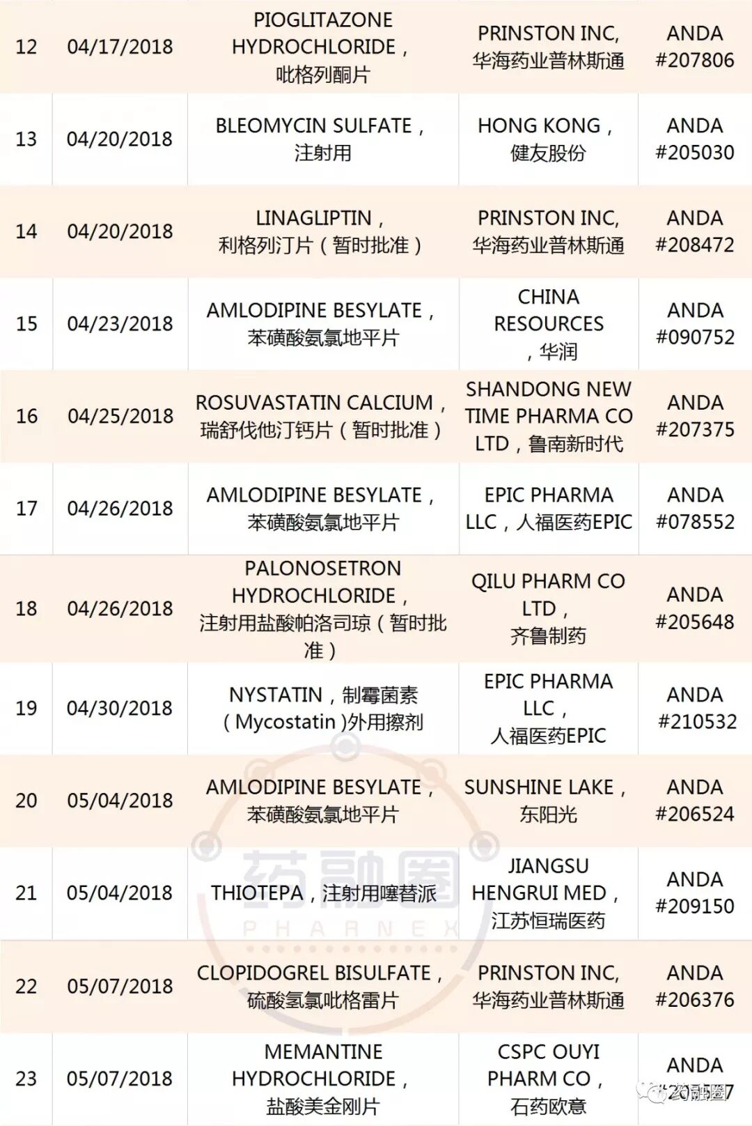 中國藥企2018至今年獲得的ANDA,截止09/12/2018