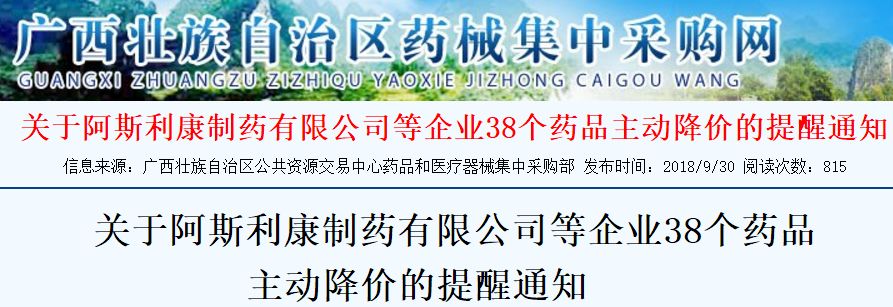 9月30日,廣西公共資源交易中心藥械集采購(gòu)部發(fā)布《關(guān)于阿斯利康制藥有限公司等企業(yè)38個(gè)藥品主動(dòng)降價(jià)的提醒通知》(下稱《通知》)。