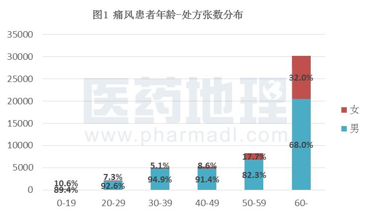 2017年上海市樣本醫(yī)院痛風(fēng)診斷抽樣處方計(jì)51,236張,其中男性患者39,183張,女性患者12,038張,男性患者約占76.5%,女性患者占23.5%,可見痛風(fēng)在男性中較為常見,女性患病人數(shù)較少,特別是50歲以下的人群性別比差距尤為懸殊。但是50歲以后隨著女性發(fā)病率逐漸增加,女性痛風(fēng)患者比例跳躍式上升,從40-49歲占比8.6%到50-59歲17.7%到60歲以上占到了32.0%,所以女性在50歲以后尤其要注重飲食結(jié)構(gòu)、生活習(xí)慣,積極監(jiān)測(cè)血尿酸水平。