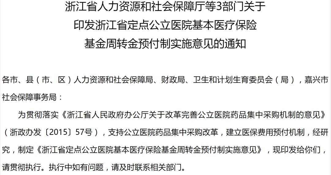日前,浙江省人社廳等3部門印發(fā)《關(guān)于浙江省定點(diǎn)公立醫(yī)院基本醫(yī)療保險基金周轉(zhuǎn)金預(yù)付制實施意見的通知》,支持公立醫(yī)院藥品集中采購改革,建立醫(yī)保費(fèi)用預(yù)付機(jī)制。