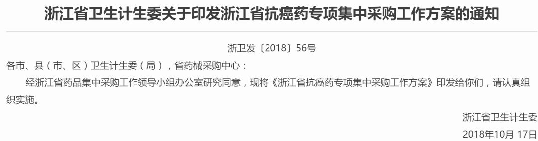 今日(10月17日),浙江省衛(wèi)計委發(fā)布通知,將開展抗癌藥專項集采工作,通知要求,2018年底前完成抗癌藥的專項集中采購工作,實現(xiàn)省藥械采購平臺在線交易,供醫(yī)療機(jī)構(gòu)采購使用。