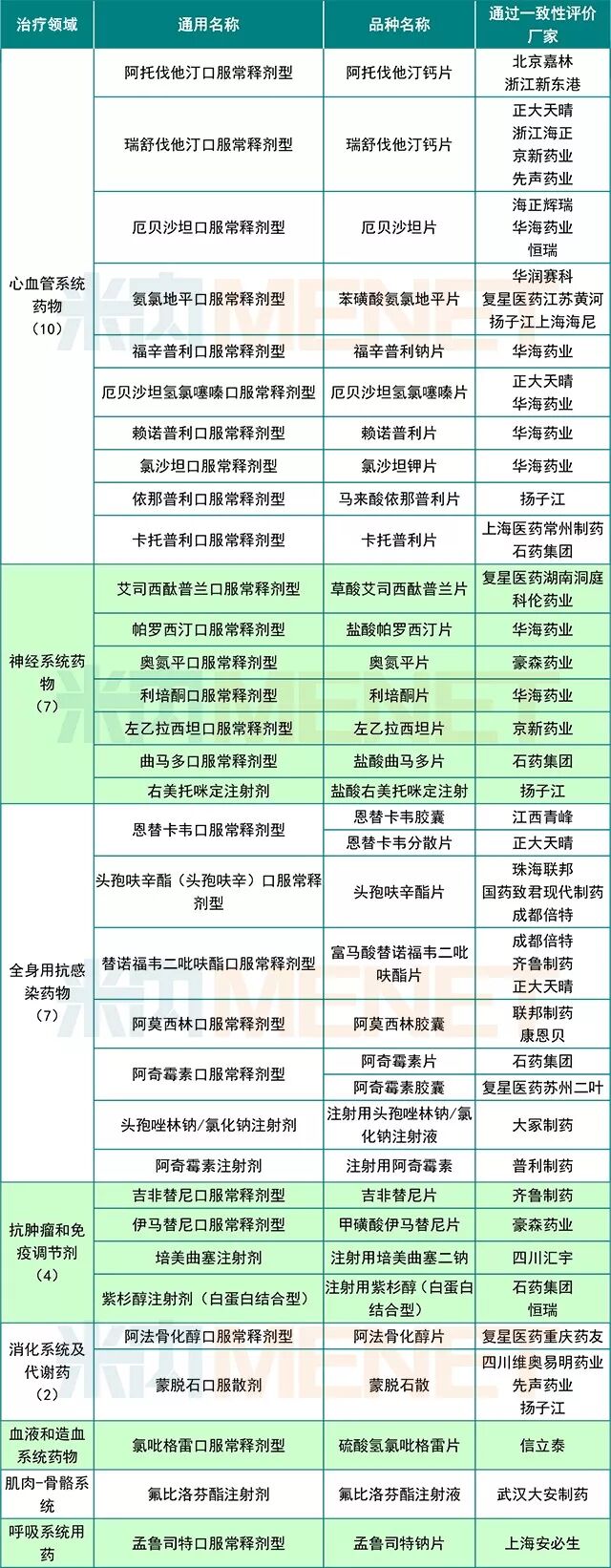 國(guó)家?guī)Я坎少?gòu)品種治療領(lǐng)域及通過一致性評(píng)價(jià)廠家