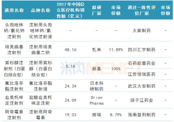 據(jù)米內(nèi)網(wǎng)數(shù)據(jù),截至10月13日,共有6個注射劑通過或視同通過一致性評價,這6個注射劑全部入選此次帶量采購清單,其中注射用培美曲塞二鈉在2017年中國公立醫(yī)療機(jī)構(gòu)終端的銷售額接近50億元。