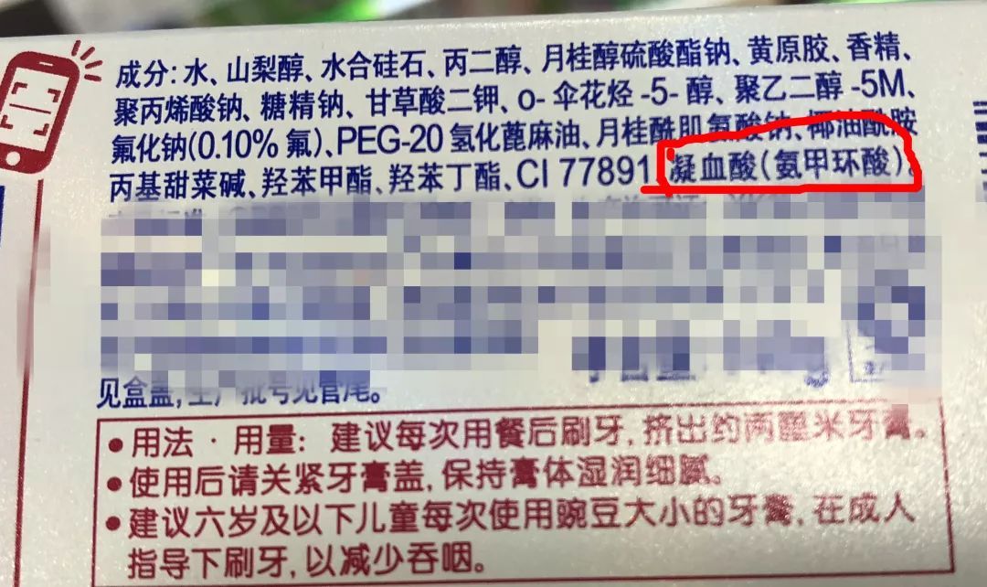 沒有在“抗過敏減少牙齦出血”的牙膏上發(fā)現(xiàn)氨甲環(huán)酸,先不要高興得太早。小編在另一款同樣有“抗紅腫出血”的牙膏成分里,發(fā)現(xiàn)了它——凝血酸。