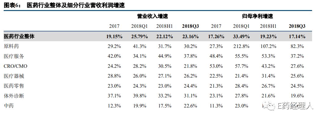 而在細分行業(yè)中,原料藥、CRO/CMO、增速最快;醫(yī)藥零售、中藥板塊在第三季度增速有所加快。