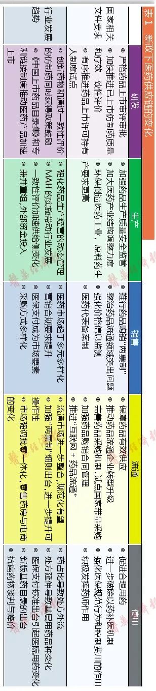 眾所周知,要進(jìn)行醫(yī)改,必須是醫(yī)藥、醫(yī)療、醫(yī)?!叭t(yī)聯(lián)動(dòng)”方可完成。供應(yīng)鏈中的醫(yī)藥范疇又可分生產(chǎn)與流通兩大領(lǐng)域,在生產(chǎn)這個(gè)領(lǐng)域又可區(qū)分為研發(fā)與生產(chǎn)兩大部分,銷售則介于生產(chǎn)與流通之間。新政下醫(yī)藥供應(yīng)鏈的變化(現(xiàn)狀與趨勢)詳見表1。