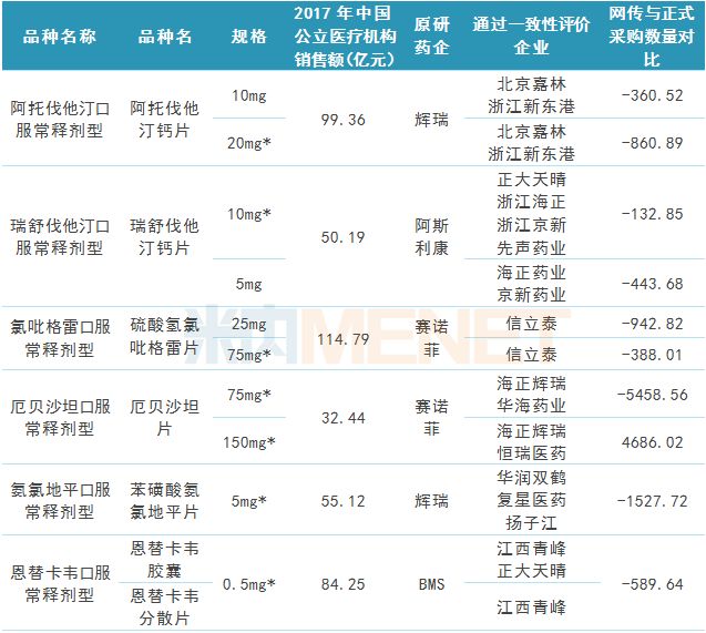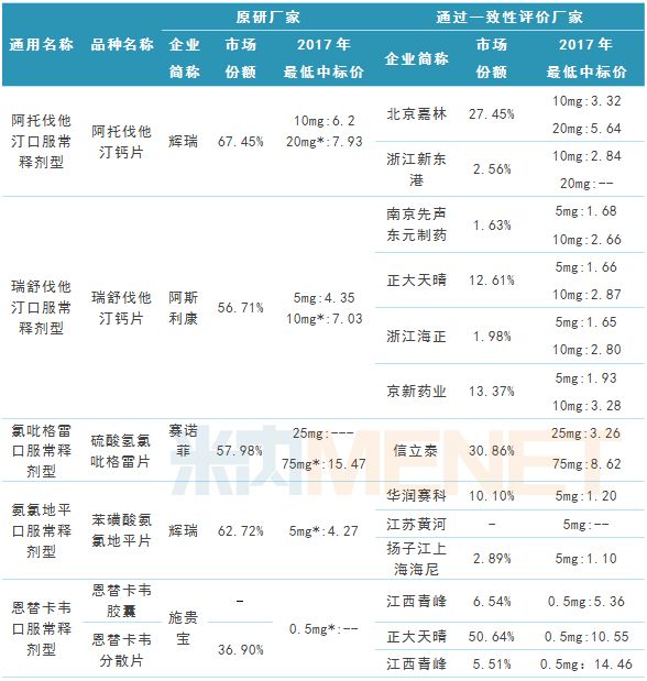 據(jù)米內(nèi)網(wǎng)數(shù)據(jù),31個通用名藥品中,有5個藥品在2017年中國公立醫(yī)療機(jī)構(gòu)終端的銷售額超過50億元,分別為阿托伐他汀、瑞舒伐他汀、氯吡格雷、氨氯地平以及恩替卡韋。由于這5大品種原研廠家的市場份額均未達(dá)到90%以上,且其2017年全國最低中標(biāo)價(jià)格平均在仿制藥2倍左右,所以假設(shè)原研廠家放棄競標(biāo),只考慮仿制藥企業(yè)的競爭情況。根據(jù)正式文件,本次帶量采購預(yù)中選及擬中選品種的確定規(guī)格包括: