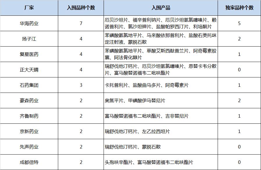 《4+7城市藥品集中采購(gòu)文件》公布的采購(gòu)目錄涉及31個(gè)品種,入圍仿制藥的廠家有29家。其中有10家藥企是多個(gè)品種(2個(gè)及以上)入圍。