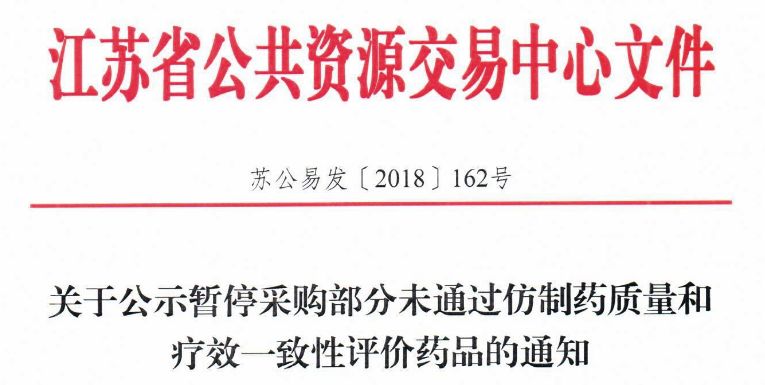 今日(11月22日),江蘇省公共資源交易中心發(fā)布《關(guān)于公示暫停采購(gòu)部分未通過(guò)仿制藥質(zhì)量和療效一致性評(píng)價(jià)藥品的通知》。