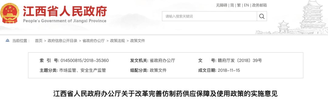 就在昨天(11月21日),江西省人民政府官網(wǎng)發(fā)布《江西省人民政府辦公廳關(guān)于改革完善仿制藥供應(yīng)保障及使用政策的實(shí)施意見(jiàn)》。