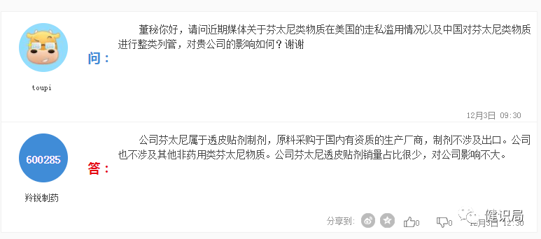 今天(12月3日),羚銳制藥在互動(dòng)平臺(tái)上回答投資者提問稱,公司芬太尼屬于透皮貼劑制劑,原料采購(gòu)于國(guó)內(nèi)有資質(zhì)的生產(chǎn)廠商,制劑不涉及出口。公司也不涉及其他非藥用類芬太尼物質(zhì)。公司芬太尼透皮貼劑銷量占比很少,對(duì)公司影響不大。