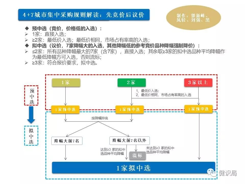 按照此次帶量采購的規(guī)則,在經(jīng)過第一步價低者入選的競價環(huán)節(jié)后,相關(guān)產(chǎn)品將進入議價過程。在這個過程中,降價幅度最大的7家入選,其他降幅較小的參考競價品種面臨強制降價,不接受者流標。