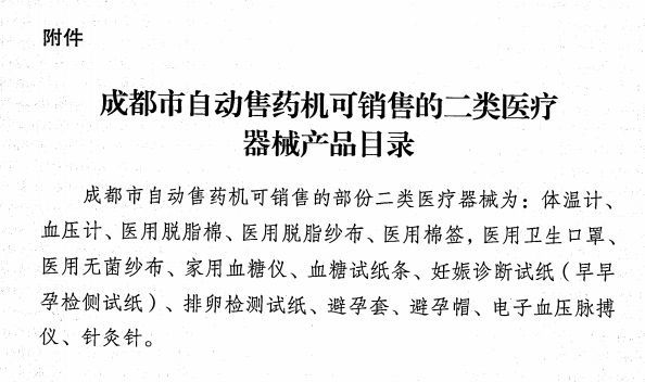 1月3日,成都市藥監(jiān)局發(fā)布《成都市食品藥品監(jiān)督管理局關(guān)于印發(fā)<成都市自動(dòng)售藥機(jī)銷售非處方藥品管理規(guī)定(試行)>的通知》。
