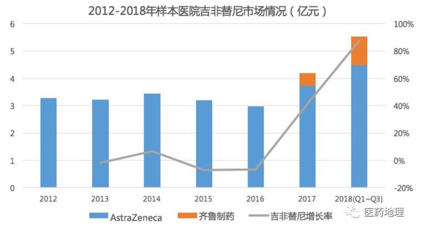 藥物綜合數(shù)據(jù)庫(PDB)顯示,隨著吉非替尼2017年被納入醫(yī)保后,其市場規(guī)模不斷擴大,2017年增長率已達44.1%,而2018年Q1-Q3的增長率更是翻了一番,達到87.6%——顯然醫(yī)保的市場放量十分明顯。