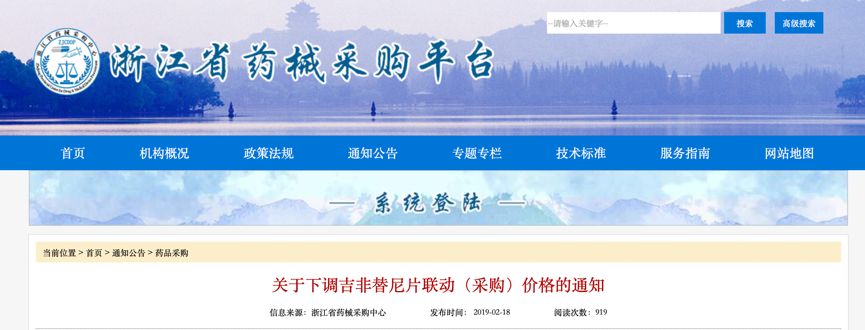 2018年12月26日,陜西省公共資源交易中心發(fā)布通知,根據(jù)企業(yè)申請,現(xiàn)將齊魯制藥(海南)有限公司生產(chǎn)的吉非替尼片(規(guī)格:0.25g*10片)掛網(wǎng)限價由1585元/盒調(diào)整為498元/盒,調(diào)整后的掛網(wǎng)限價即日執(zhí)行。