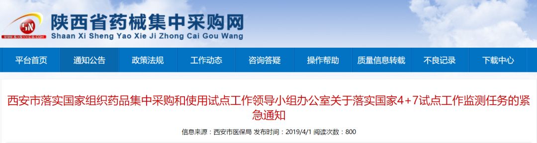 昨日(4月1日),西安市醫(yī)保局發(fā)布《西安市落實(shí)國家組織藥品集中采購和使用試點(diǎn)工作領(lǐng)導(dǎo)小組辦公室關(guān)于落實(shí)國家4+7試點(diǎn)工作監(jiān)測任務(wù)的緊急通知》(以下簡稱《通知》)。