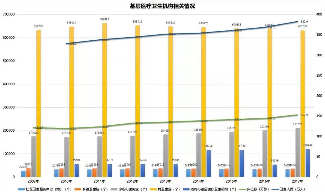 基層醫(yī)療衛(wèi)生機(jī)構(gòu)包括社區(qū)衛(wèi)生服務(wù)中心(站)、鄉(xiāng)鎮(zhèn)衛(wèi)生院、診所和醫(yī)務(wù)室、村衛(wèi)生室。2009年至2017年,我國基層醫(yī)療衛(wèi)生機(jī)構(gòu)總數(shù)從87.3余萬個增至93.3萬余個。除了數(shù)量上的劇增,更有幾項(xiàng)數(shù)字的變化折射國家對于“強(qiáng)基層”的決心和魄力(見下圖)。